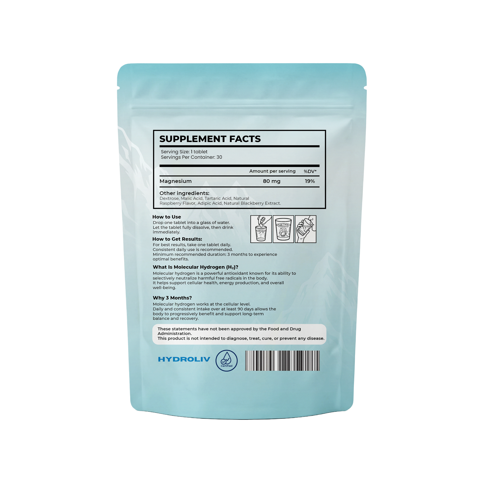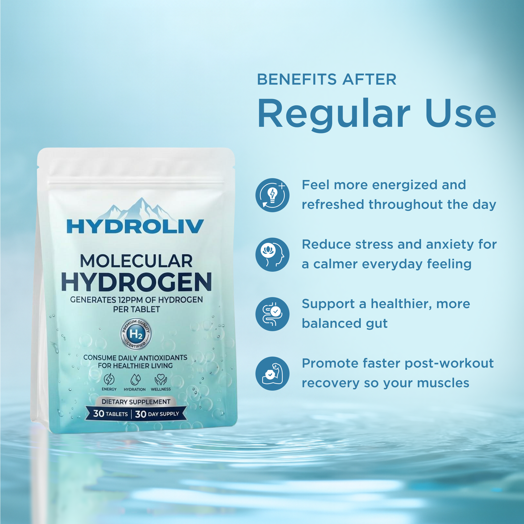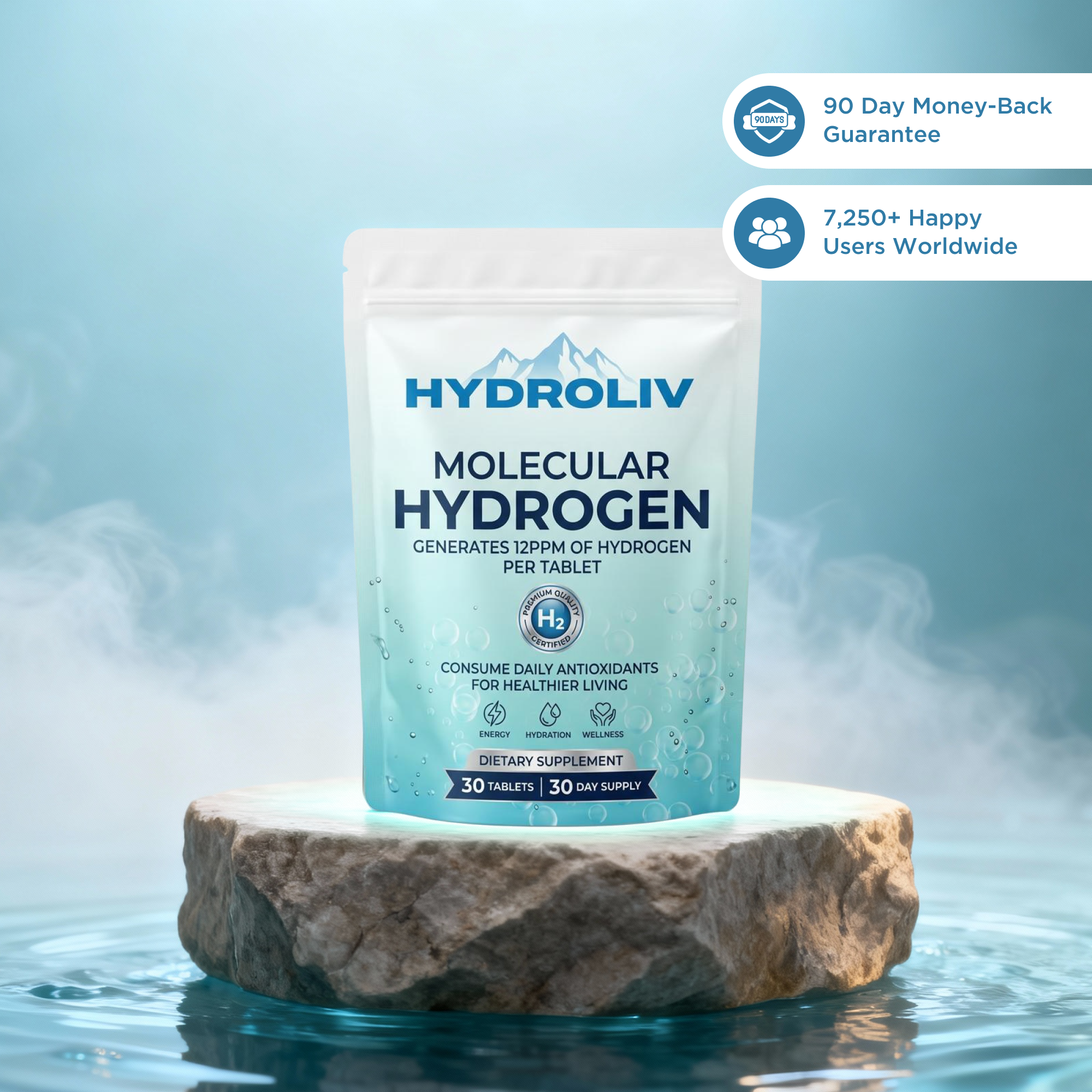 Hydrogen uses natural, well-studied ingredients that are generally safe. Side effects are extremely rare but may include mild digestive adjustment in the first few days as your body acclimates. The tablets must be dissolved in water only — never swallow them directly, as this can be harmful.
