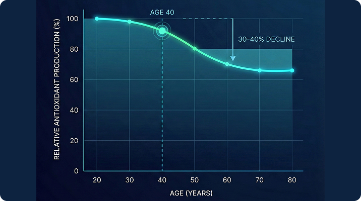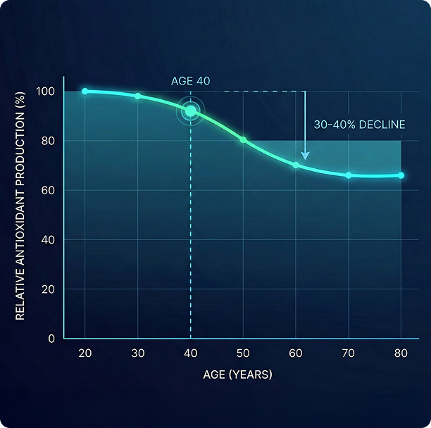 Studies show that natural antioxidant production decreases by 30-40% after age 40. As our cellular defenses weaken, oxidative damage compounds faster than our bodies can repair it — leading to fatigue, inflammation, and brain fog, which so many people experience.